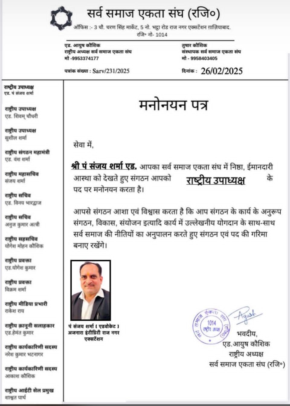 National पं. संजय शर्मा एडवोकेट को सर्व समाज एकता संघ का राष्ट्रीय उपाध्यक्ष चुना गया 11 months ago Satbir Singh गाजियाबाद। पं. संजय शर्मा एडवोकेट अजनारा इंटीग्रिटी, राजनगर एक्सटेंशन, गाजियाबाद निवासी, को सर्व समाज एकता संघ का राष्ट्रीय उपाध्यक्ष चुने जाने पर हार्दिक बधाई एवं शुभकामनाएँ ।Post navigationPrevious धनुष की आगामी फिल्म “कुबेरा” की रिलीज डेट से उठा पर्दा, इस दिन सिनेमाघरों में दस्तक देगी फिल्म Next महाकुंभ में सफाई और स्वास्थ्य कर्मचारियों को मिलेगा 10,000 रुपये का बोनस – मुख्यमंत्री योगी